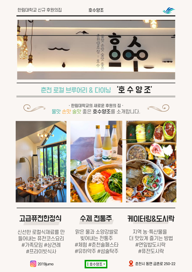 춘천 전통주 양조장 1호로 2019년부터 영업을 시작했습니다. 호수라는 명칭에는 호반의 도시 춘천을 대표한다는 의미와 술을 담은 호수라는 두 가지 의미가 모두 들어가 있습니다. 춘천의 맑은 물과 건강한 쌀로 빚은 3종류의 전통주인 섬술탁주, 유하탁주, 유하약주를 주로 생산하며 춘천 로컬 식재료를 사용한 정갈한 음식과 함께 판매하고 있습니다. 간단한 도시락 메뉴와 점심, 저녁 상차림 메뉴 외에 전통주와 함께하는 고급한정식 메뉴도 즐길 수 있습니다. 30명 규모의 단체와 소규모의 프라이빗한 모임에 추천드립니다. 당일 예약은 어려우니 반드시 사전 예약을 해주세요.