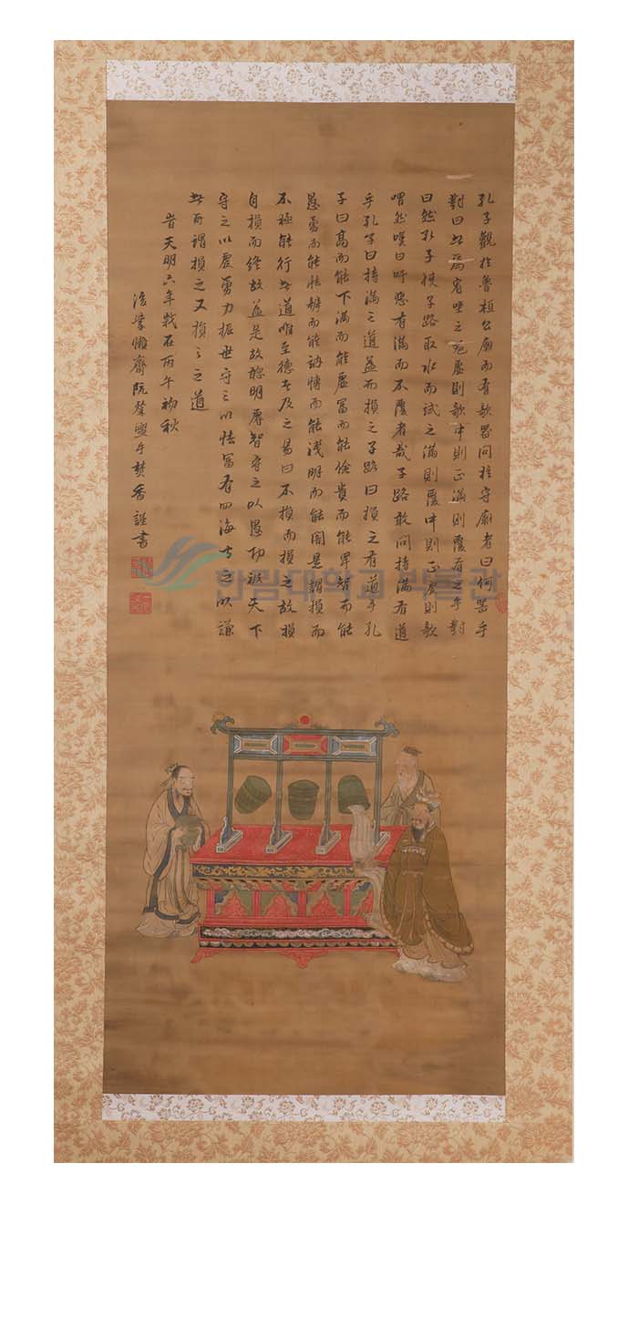 이 그림은 공자와 그의 제자 자로(子路)가 노나라 환공(桓公)의 사당에서 비스듬하게 기울어진 기기(攲器)에 물이 채워지는 과정을 보며