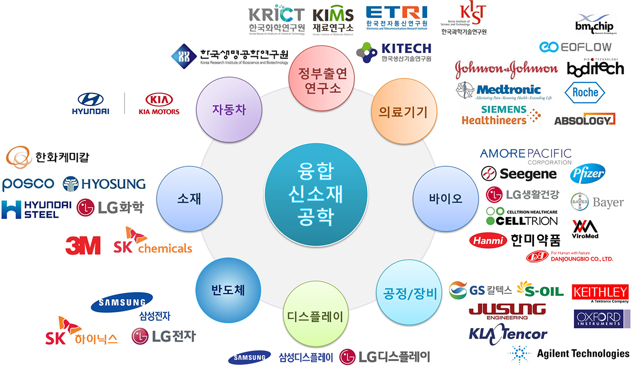 융합신소재공학은 국가 핵심 기반 산업인 나노분야, 바이오분야, 신소재분야를 융합하여 21세기 문명을 이끌 혁신적인 신산업을 창출하고 기존 산업구조를 고도화시켜 국부를 창출할 수 있는 국가의 성장동력으로 자리 매김할 것입니다. 따라서 졸업후 국가 핵심 산업인 반도체 산업, 디스플레이 산업, 공정/장비 산업, 소재/부품 산업, 자동차 산업, 바이오 산업, 의료서비스 산업 등 매우 다양한 분야에 진출할 수 있을 뿐만 아니라, 국공립 연구소 및 정부기관에서도 근무할 수 있으며, 학문의 특성상 벤처 창업을 통한 기업가로의 꿈을 실현 할 수도 있습니다.